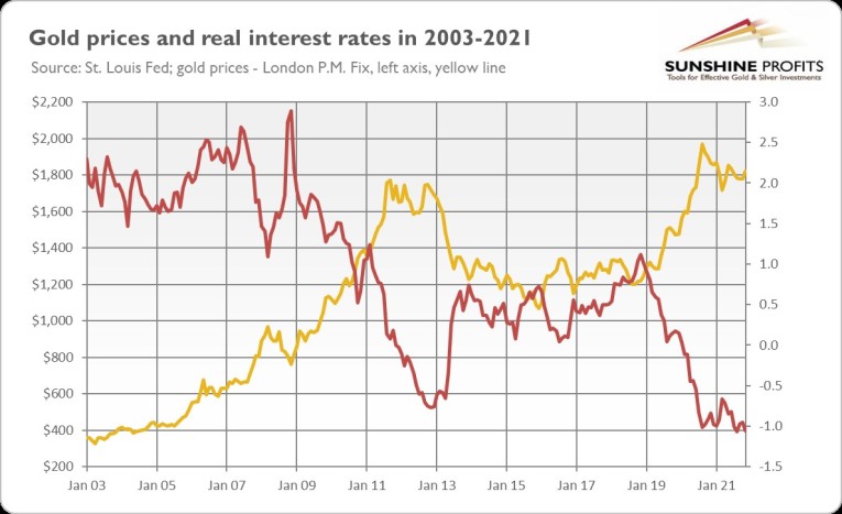 Do we have to go back that far in time, though? Maybe the 2020 peak in gold prices was like the 2011 peak and we are now somewhere in 2012-2013, on the eve of a great downward move in the gold market? Some similarities cannot be denied: the economy is recovering from a recession, while the Fed is tightening its monetary policy, and gold shows weakness with its inability to surpass $1,800. So, some concerns are warranted. I pointed out a long time ago the threat of an upward move in the real interest rates (as they are at record low levels), which could sink the precious metals market.