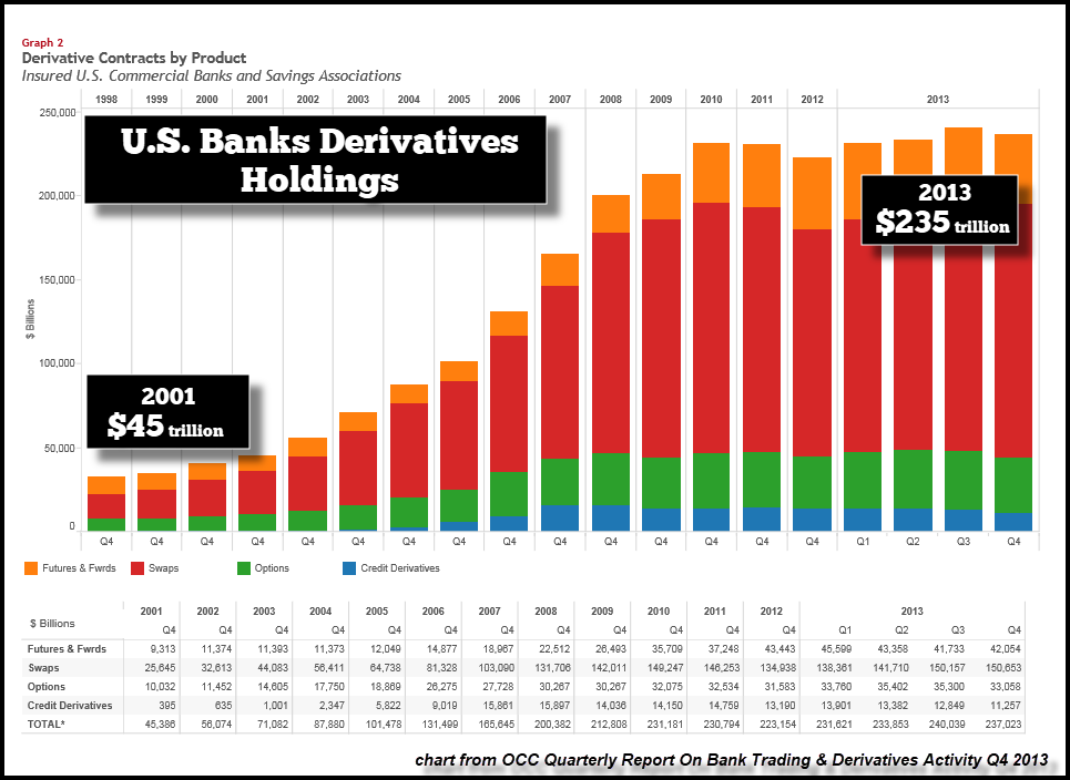 The reason for the significant oil price rise in the 2000’s was due to the massive increase in global debt and derivatives.  According to the OCC Quarterly Reports on Bank Trading and Derivatives Activity, the total notional value of U.S. Banks Derivative Holdings increased from $45 trillion in 2001 to $235 trillion in 2013: