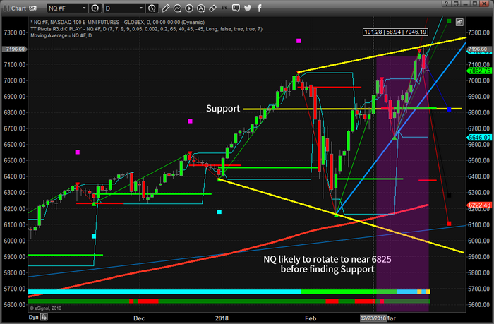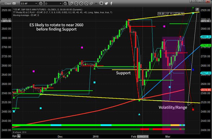 We believe the ES will rotate lower over the next few days to attempt to retest support near 2660 before attempting another short rally likely ending near, or just above 2800. This would represent a failed price rotation with a new double top or higher high price level very similar to the second top near the end of September 2014. We believe this second top could produce another deeper dive in prices sometime in early April 2018. Still, the 2660 level is support and we would have to be cautious near those levels.