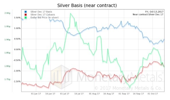 For each metal, we will look at a graph of the basis and cobasis overlaid with the price of the dollar in terms of the respective metal. It will make it easier to provide brief commentary. The dollar will be represented in green, the basis in blue and cobasis in red.