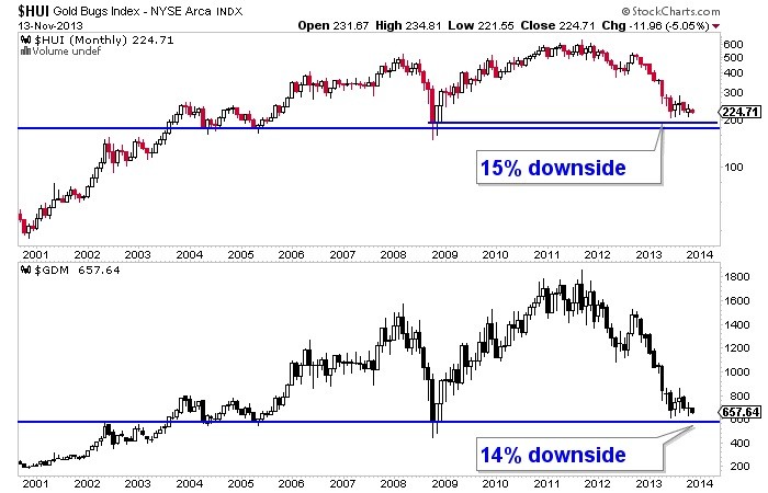 First of all, he assumes I’m implying that the gold stocks would not decline given a decline in the price of Gold. This is totally absurd. I noted: There is very strong support sitting right below the summer lows. Here is that same chart which shows the downside potential to that major support.