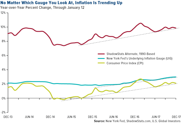 But which measure of inflation is most accurate? The Fed’s preferred gauge, the consumer price index (CPI), rose 2.1 percent year-over-year in December. Then there’s the New York Fed’s recently launched Underlying Inflation Gauge (UIG), which claims to forecast inflation better than the CPI by taking into consideration a “broad data set that extends beyond price series to include the specific and time-varying persistence of individual subcomponents of an inflation series.” The UIG rose nearly 3 percent in December. And finally, the alternate CPI estimate, which uses the official methodology before it was revised in 1990, shows that inflation could be closer to 10 percent.
