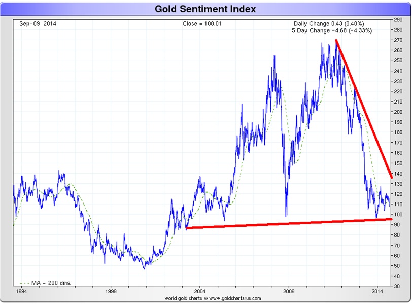 The Fear Index is testing support of a rising trendline from the low of 2001. This is not dissimilar to the price of gold itself that is testing its long-term support. Yet there remains fear that gold is going to collapse even further to $1,000 to $700. Gold sentiment is close to where it was at the 2008 financial crash low although still above where it was in 2001.