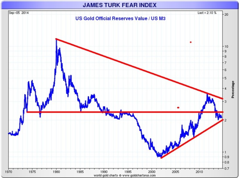 The James Turk Fear Index has always been interesting www.fgmr.com. It is an easy concept. The Turk Fear Index is a measurement of gold’s relative value in relation to currency. The Turk Fear Index centres on the US by comparing gold’s value to money but a fear index could be calculated for any country and any currency and for that matter the world as well. The US being the world’s largest economy is most likely a good indicator for the rest of the world.