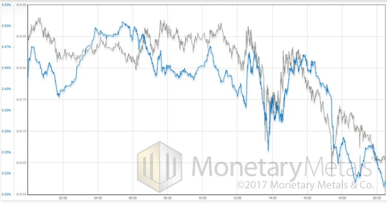 Our calculated Monetary Metals silver fundamental price fell $0.25 to $17.05.