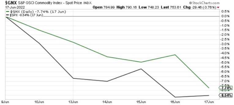 To explain, the green line above tracks the S&P GSCI, while the black line above tracks the S&P 500. As you can see, hawkish rhetoric and a 75 basis point rate hike had their desired effect.