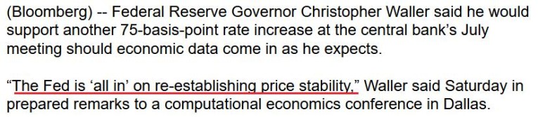 “This week, the FOMC took another significant step toward achieving our inflation objective by raising the Federal Funds rate target by 75 basis points. In my view, and I speak only for myself, if the data comes in as I expect I will support a similar-sized move at our July meeting.”