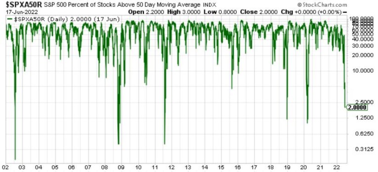 To explain, the green line above tracks the percentage of S&P 500 stocks above their 50-day moving average. If you analyze the right side of the chart, you can see that only 2% of S&P 500 constituents hold the key level, and the reading is abnormally low.