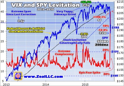 The Fed’s extreme selloff-suppression efforts fueled one of the most extraordinary stock-market runs in history in recent years. While no one could know in advance when the catalyst would arrive to ignite all that epic complacency, it emerged out of the blue with no warning just a week ago. And even the initial resulting devastation is incredible, as this Fed-levitation-era chart of the VIX and leading SPY S&P 500 ETF shows.