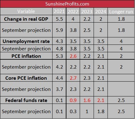 Last but definitely not least, more interest rate hikes are coming. According to the latest dot plot, FOMC members see three increases in the federal funds rate next year as appropriate. That’s a huge hawkish turn compared to September, when they perceived only one interest rate hike as desired. Central bankers expect another three hikes in 2023 (the same as in September) and additional two in 2024 (one less than in September). Hence, the whole forecasted path of the interest rates becomes steeper and the Fed is now anticipating eight 25-basis point rate hikes from 2022 to 2024, one more than they saw in September.