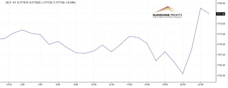 Indeed, the chart below shows that theory and practice are not the same. Initially, the price of gold declined from around $1,765 to around $1,755, but it quickly rebounded and even increased to $1,780.