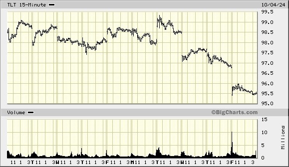 Bond prices, however, peaked at about the same time the Fed made official its latest gratuitous action. Over the past three days, bond prices have dropped sharply, gapping down at the market open each day. Below is a chart of TLT (20+ Year Treasury Bond ETF)…