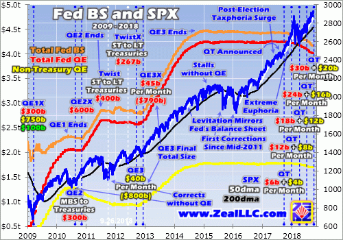 In this just-finishing Q3’18, QT was supposed to climb to $40b per month. While the Fed’s final quarterly balance-sheet data wasn’t yet released when this essay was published, QT was roughly on track at $99b. And the stock markets continued climbing despite this record Fed tightening, with the SPX surging 6.9% quarter-to-date as of Wednesday. The Fed’s QT has indeed unfolded just as promised over this past year.
