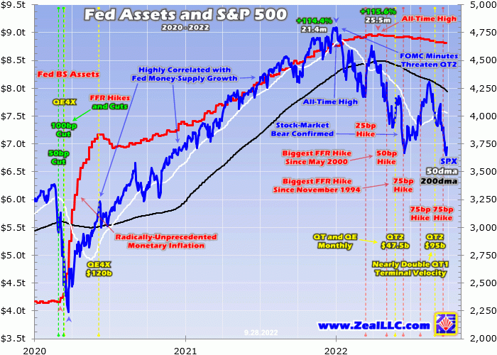 The bottom line is the Fed’s aggressive new quantitative-tightening campaign is greatly imperiling these lofty stock markets. They were levitated to extreme heights and dangerous bubble valuations by epic Fed QE4 money printing after the pandemic-lockdown stock panic. Starting to unwind that deluge of liquidity with QT2 will suck big capital out of stocks. That will seriously exacerbate their young bear underway.