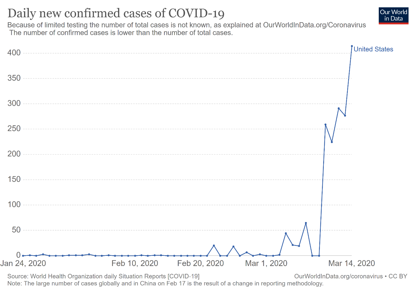 Chart 1: Daily new confirmed cases of COVID-19 in the US from January to March 14, 2020