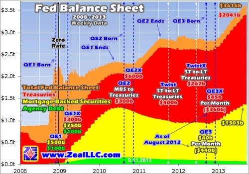 But if this week’s stunning QE3-taper delay indeed costs 6 months due to the big Fed transition and near certainty of the long overdue major stock-market correction, QE3 is going to be vastly bigger than most had imagined. Tapering still has to be gradual to minimize bond-market disruptions, so that additional $383b of QE3 over the 9 months of tapering is almost certainly still baked in. Add in 6 full months on top of that!