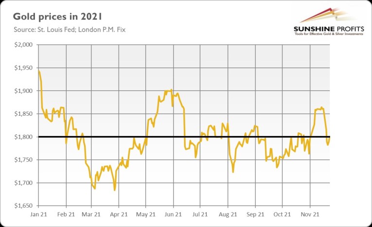 Did you enjoy your roast turkey? I hope so, and I hope that its taste – and Thanksgiving in general – sweetened the recent declines in gold prices. As the chart below shows, the price of the yellow metal (London P.M. Fix) plunged from above $1,860 two weeks ago to above $1,780 last week. It has slightly rebounded since then, but, well, only slightly.