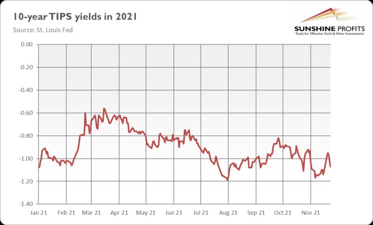 This is something I warned investors against earlier this month. I wrote in the Fundamental Gold Report on November 16 that “when something reaches the bottom, it should rebound later. And if real interest rates start to rally, then gold could struggle again.” This is exactly what happened. Later, in the article on November 18, I added that “I will feel more confident about the strength of the recent rally when gold rises above $1,900”.