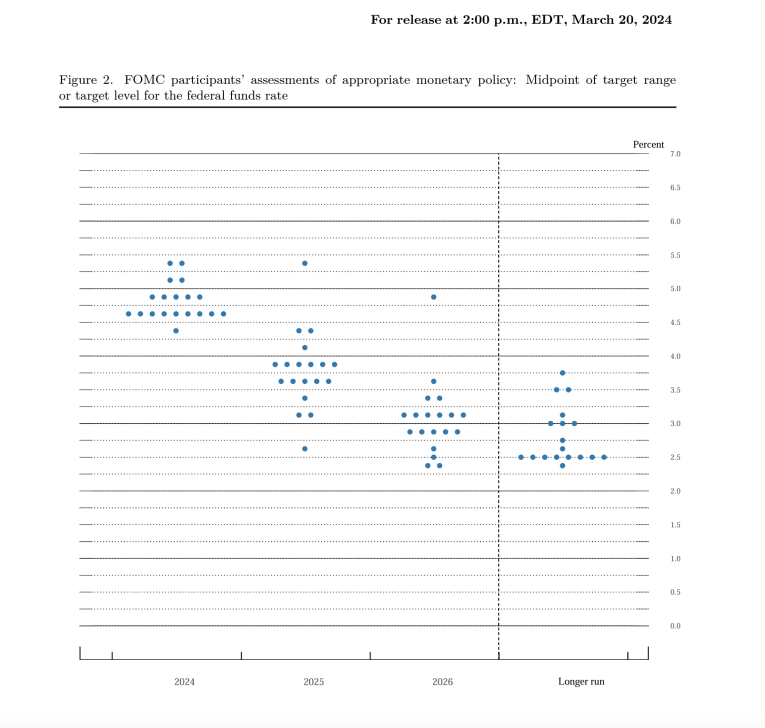 Digging into the details, 10 of the 19 FOMC members projected three cuts this year. That was down from 11 in the December dot plot. On the other hand, every committee member now anticipates at least one cut this year. In December, two members projected no cuts.