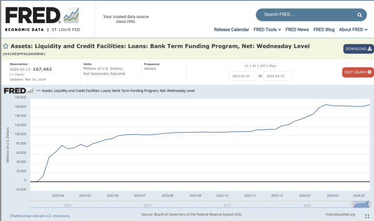 As one would expect, the balance in the BTFP surged initially as banks tapped into the bailout. But borrowing never stopped.