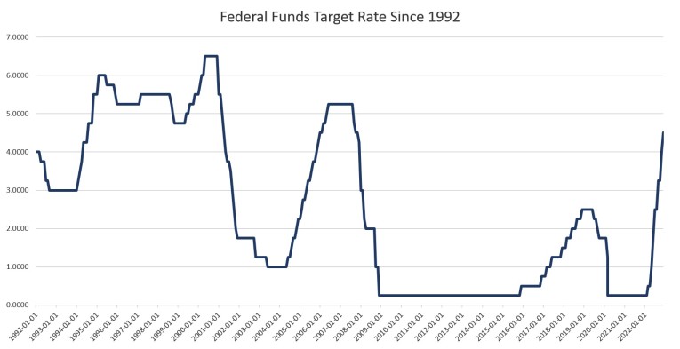 The Federal Reserve's Federal Open Market Committee (FOMC) on Wednesday announced it will raise the target federal funds rate by 50 basis points, bringing the target rate to 4.5 percent. Wednesday's rate hike followed four hikes in a row of 75 basis points, and is the smallest rate hike since March.