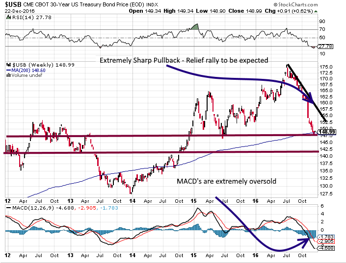 This is a weekly chart containing five years worth of data (each bar represents one week’s worth of data); it is easy to spot that Bond market is extremely oversold. Trump’s win has created a lot of enthusiasm, and a large number of individuals who were sitting on the sidelines moved out of bonds and into the market. As the move has been incredibly powerful, it is likely that bonds could experience a counter move that is equally strong.