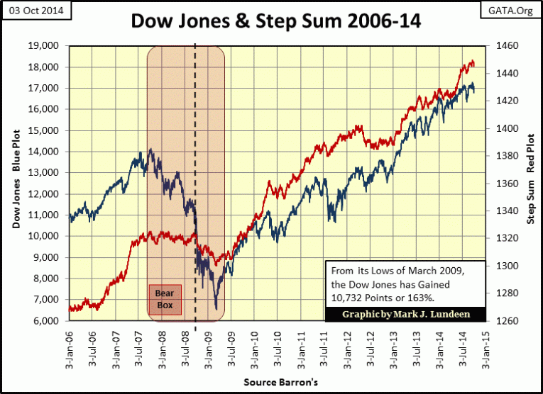 In my opinion, the percentage that the Dow Jones declined in March 2009 was insufficient to accomplish what all bear markets need to accomplish when a financial system is in crisis – to eliminate unviable assets from society’s balance sheet. In 2014 the trillions of dollars of problematic mortgages from 2007-09 are still masquerading as assets somewhere, for instance, on the books of the Federal Reserve (Red Plot below).
