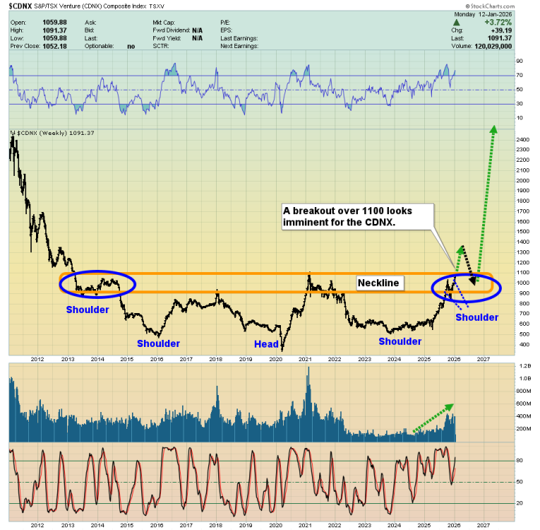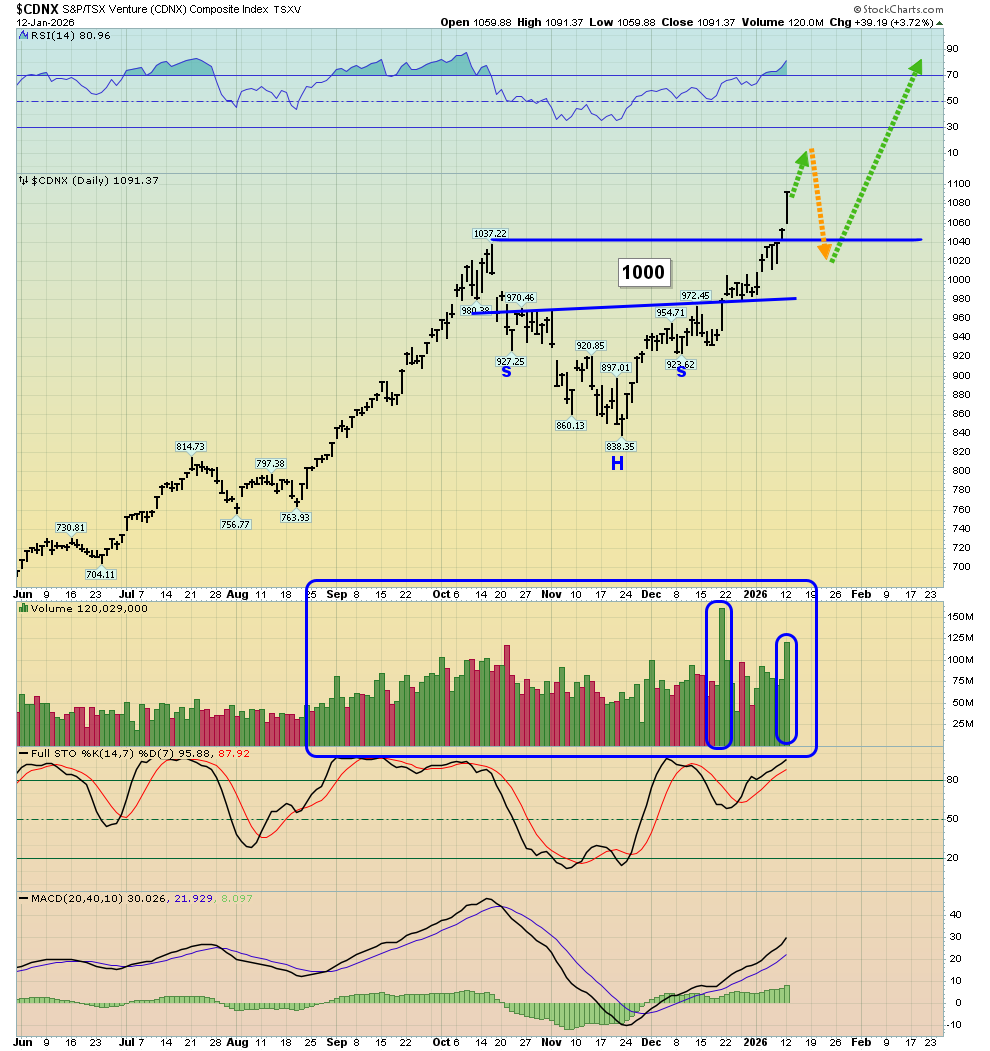 This is the spectacular CDNX daily chart which is a key indicator not just for the juniors, but for all the miners.