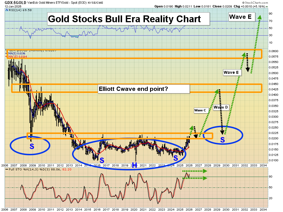 It now looks like the junior miners are poised for what is likely to be seen (in hindsight by mainstream money managers) as the greatest technical breakout in the history of markets. An April peak is likely to mark the end of the breakout move and a classic pullback to the neckline of the immense base pattern should unfold from there.