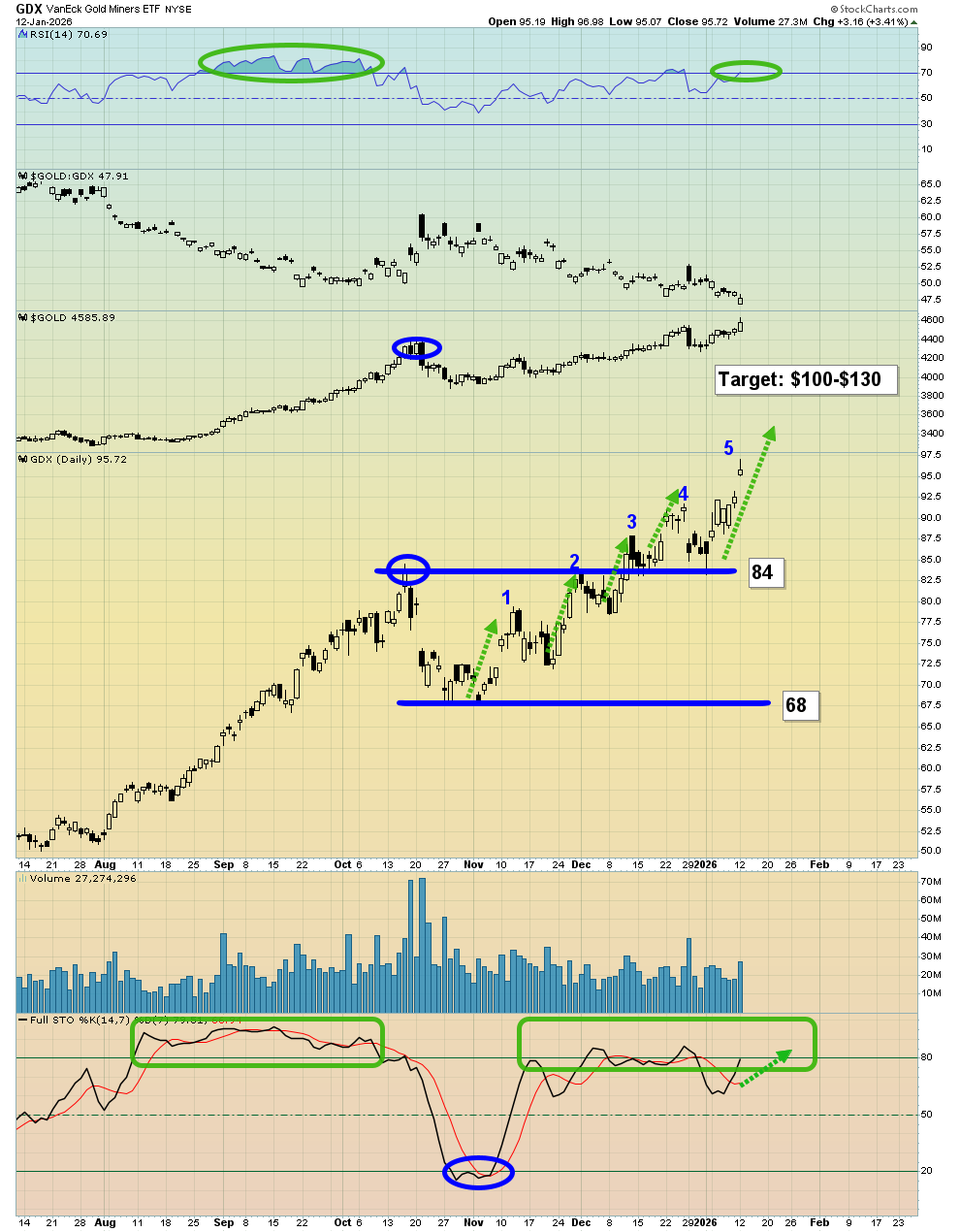 It’s likely that GDX doesn’t reach an intermediate-term peak until it rises to $120-$130, turning the $100 zone into a potential floor and launchpad… for a surge to $200 and more!