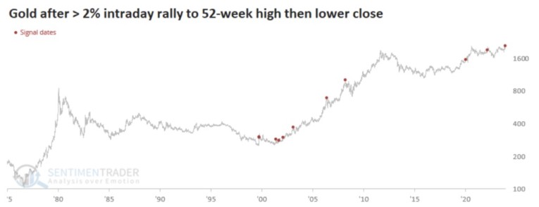 This chart plots points at which Gold hit a new 52-week high but reversed lower as much as 2% or more.