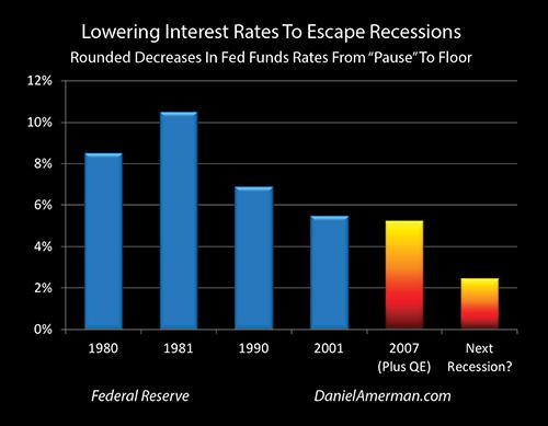 However, when we look to the bar on the right - current Fed Funds rates are less than 2.50%, which means that the Fed has a big problem - it only has about a third of the power needed, the shock factor traditionally used, to jolt the economy out of the next recession.