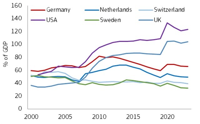 A survey by the Swiss Federal Finance Administration concluded that rules improve fiscal performance in terms of better budget balances, lower debt, and reduced spending volatility. In addition, empirical research showed that fiscal rules are associated with more-accurate budget forecasts and improved sovereign bond ratings. This explains why even countries with softer fiscal rules, such as Australia and the Netherlands, still benefit from better medium-term budget planning and improved fiscal outcomes. In recent years, public debt has declined to moderate levels in Germany and other countries with fiscal rules—despite the pandemic and war in Ukraine—whereas it has grown to very high levels in the United States and the United Kingdom (Figure 1). As a matter of fact, the US Government Accountability Office recommends that the US introduces strict fiscal rules as well to correct its “unsustainable long-term fiscal path.”