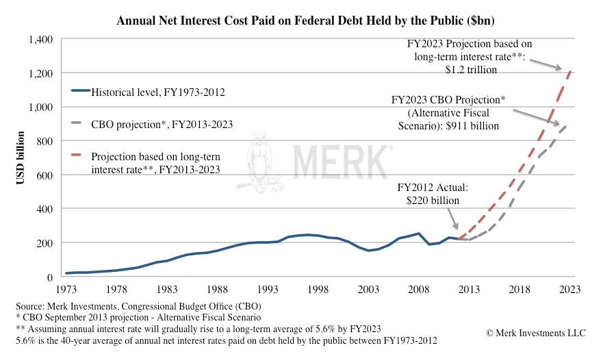 What about rising rates? Can rising rates derail the gold price? If former Fed Chair Paul Volcker were in charge at the Fed today and thinking of imposing the sort of policies he imposed in the early 1980s, there would be a lot of chatter about positive real interest rates. Except that, in our assessment, we would risk a revolution if we introduced Volcker style interest rate policies today. In the early 1980s, high interest rates were painful, but in today’s environment with consumers no longer merely financing their homes, but buying just about everything on credit, higher rates may well have a crippling impact on the economy much sooner. Notably, government debt would also need to be financed at a higher rate. Currently, the U.S. government spends less than 2% on its (marketable) debt, or about $200 billion a year. Using the projections of the Congressional Budget Office, if the average cost of borrowing were to go back up to its historical average, the government would pay over $1 trillion more in interest expense in a decade from now: