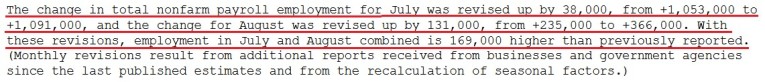 To explain, July’s data was revised upward by 38,000 (increased for the second time), while August’s data was revised upward by 131,000. As a result, 169,000 more jobs were added than previously reported.