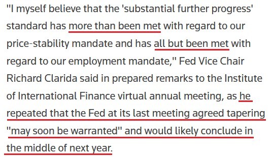 Also making the rounds, Fed Vice Chairman Richard Clarida supported the hawkish rhetoric on Oct. 12. Speaking at the Institute of International Finance’s virtual annual meeting, he said that “the risks to inflation are to the upside.” And after conceding that “the big unknown right now is how long it will take for these bottleneck effects to work their way through,” he admitted: