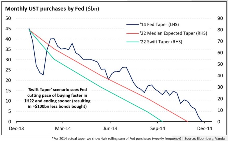 To explain, the dark blue line above tracks the pace of the Fed’s taper following its announcement in December 2013, while the orange line above tracks the consensus estimate this time around. However, if you focus your attention on the light blue line, you can see that Powell’s taper timeline pushes QE to zero in advance of both the precedent set in 2014 and the current consensus estimate.