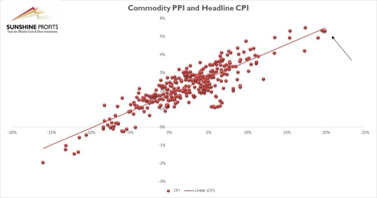 To explain, the green line above tracks the YoY percentage change in the commodity PPI, while the red line above tracks the YoY percentage change in the headline CPI. If you analyze the relationship, you can see that the pair have a close connection.