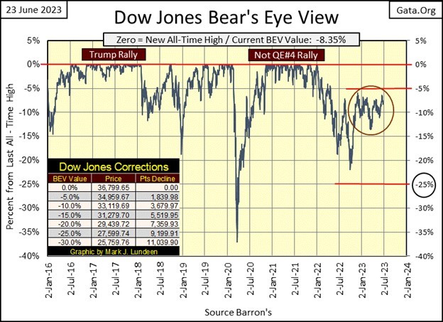 Of the above two possibilities, breaking below its BEV -15% line is much more significant than should the Dow Jones close above its BEV -5% line, or even seeing the Dow Jones make another BEV Zero. And should (when) the Dow Jones take out its lows of last September’s (BEV -21.94% / 28,725), we may see some exciting times in the stock market.