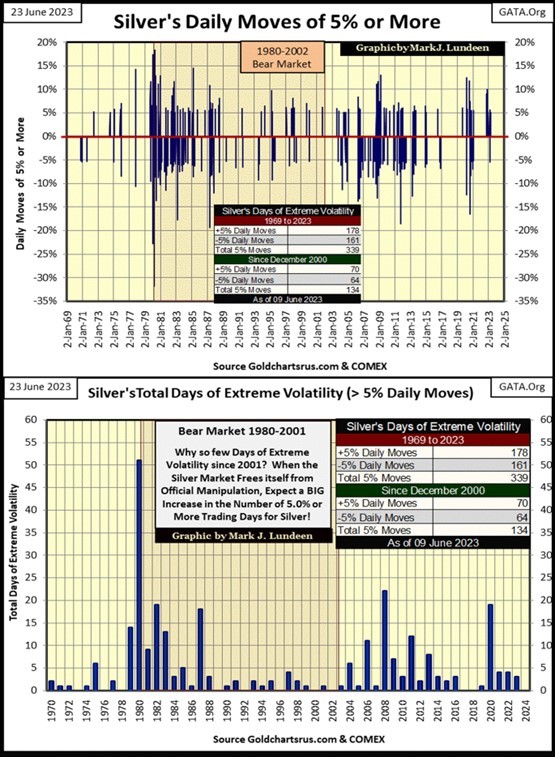 Since 1983, gold’s daily volatility has greatly decreased, as seen in the reduction in the number of gold’s 3% days below. But since gold began its second bull market in 2001, 3% days never became as frequent as they were in the 1970s, which tells us what? I believe it tells us how heavily involved the “policy makers” have become in the gold and silver futures market, making the old monetary metal markets as boring and frustrating to investors as they could make them.