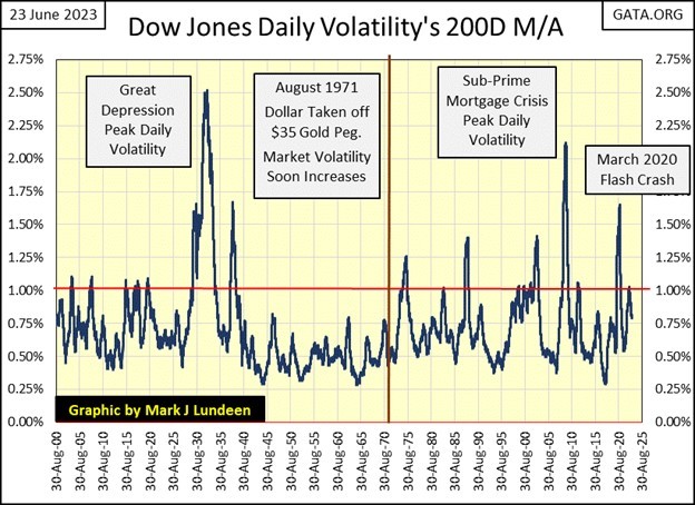 Following this volatility model will not get investors in at the absolute bottom of a bear market, or out at the absolute top of a bull market. There were times this volatility model left much to be desired, as from the end of WWII to August 1971. For almost three decades, Dow Jones’ volatility failed to rise above the 1.00% line. But since the dollar was decoupled from its $35 gold peg in August 1971, timing market entry and exit points using Dow Jones’ volatility has proven to be very useful.