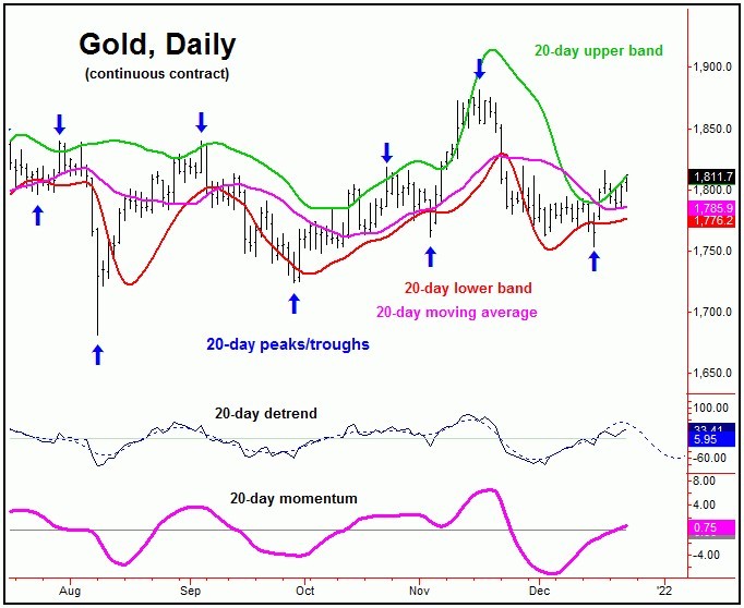 For the shorter-term view for gold, the last good swing bottom came from the 20-day cycle, which is shown again on the chart below: