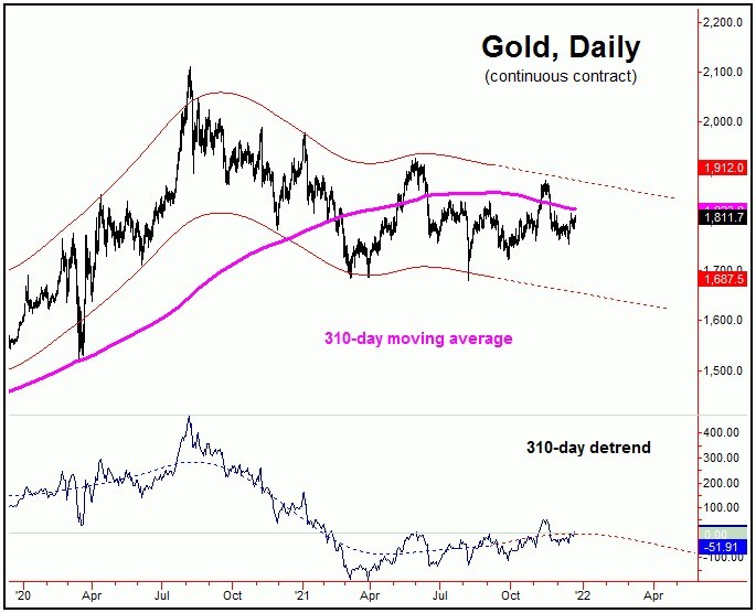 The last trough for this 310-day cycle was registered back in the Spring of 2021. Until proven otherwise, the downward phase of this wave is currently deemed to be in force, ideally remaining intact into late-Spring or early-Summer of 2022. The position of this 310-day cycle is what favors the upward phase of the smaller 72-day wave to end up as a countertrend affair. Only a reversal above the 1882.10 swing top would negate this assessment - and thus offer up a more bullish view for the mid-term.