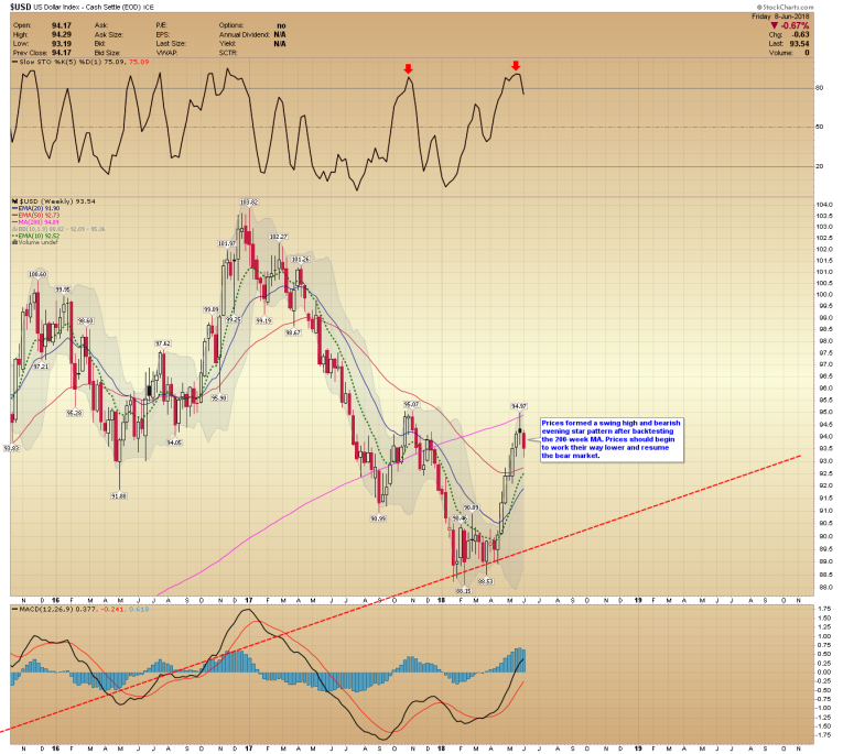 Prices formed a swing high and bearish evening star pattern after back testing the 200-week MA. Prices should begin to work their way lower and resume the bear market.