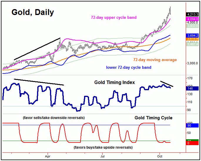 As mentioned last weekend, at 72-day (or greater) cycle tops, the Gold Timing Index tends to diverge from price action - which it had yet to do - thus favoring additional strength into last week, which we did see.