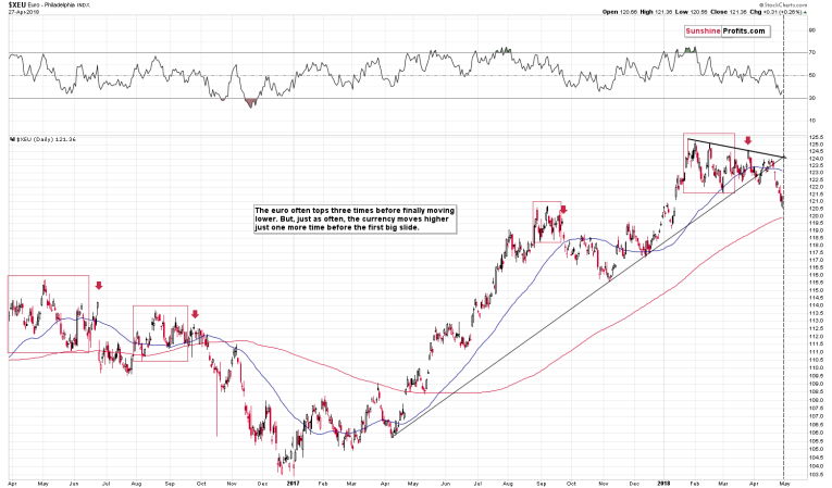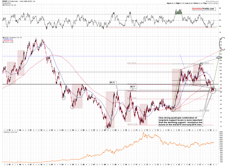 But, does it have to start right away? Not necessarily. The USD Index could form another reversal as that’s what it used to do quite a few times in the past. For instance, the early December 2016 reversal was not the final one – the USDX topped two days later. The early April 2016 reversal was also followed by 2 (in terms of daily closing prices) or 3 (in intraday terms) days of higher prices. In such case, we could even see a quick move to the 61.8% Fibonacci retracement, which is approximately at the 2018 high and November and October 2017 lows.