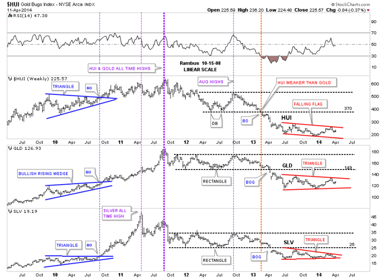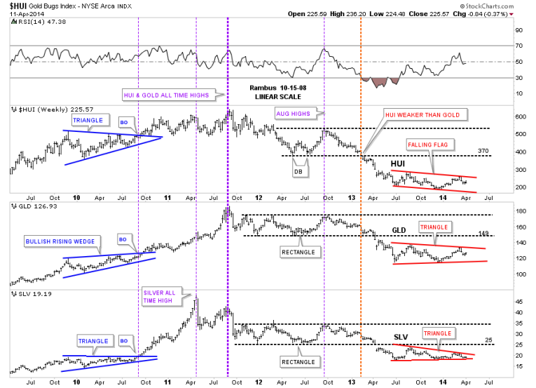 Let’s not fast forward to the heavy red dashed vertical line that shows how the HUI was the first of the three to really show weakness by breaking below its horizontal black dashed line first. The precious metals stocks were leading he way down. It took about another 12 weeks or so before GLD and SLV joined the party to the downside when they finally broke out of their nearly 22 month consolidation patterns with a breakout gap. As with the blue consolidation patterns on the left side of the chart our current red consolidation patterns all bottomed at the same time, late June of 2013, and have been chopping out their respective chart patterns ever since. As you can see all three are working on their fourth reversal points right now. Even though the HUI is building out a falling flag formation, which will be pretty bearish if it breaks through the bottom rail, the SLV is trading the closest to its bottom rail of its red triangle. This chart gives you the big picture look and lets you know where we stand and what to look for.