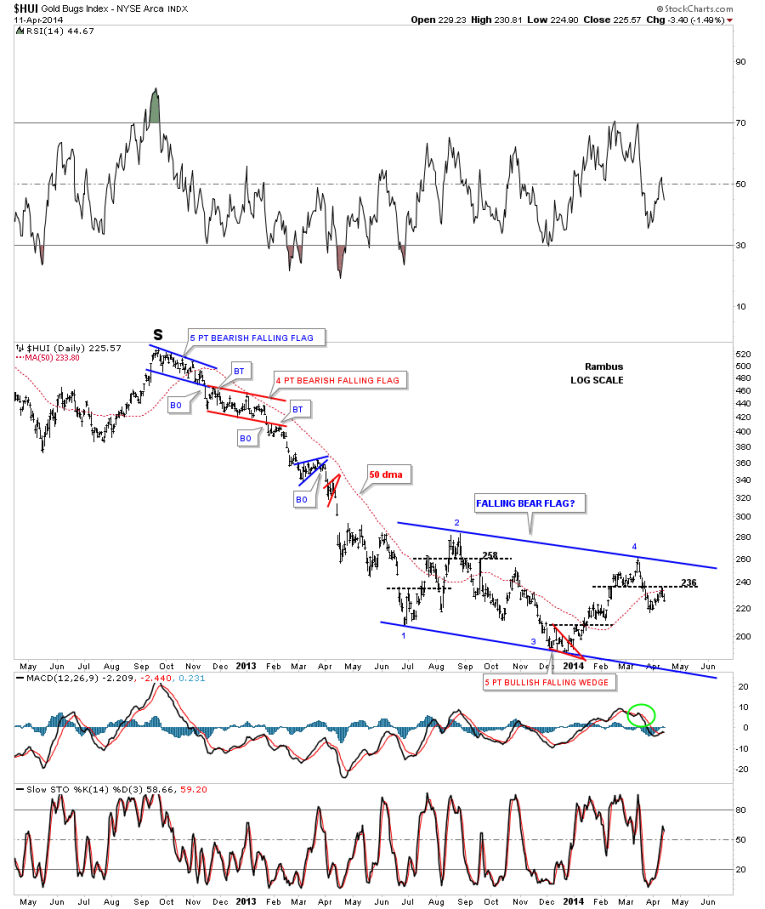 What was so frustrating for those of us that were holding precious metals stocks is that they hardly moved when gold and silver had their parabolic moves higher. As you can see the HUI did in fact make its bull market high at the same time gold did but the HUI had no parabolic move up. As you can see it was more of a slightly rising horizontal type move. That had to be one of the worst times to be a gold bug, to see gold and silver go parabolic and the precious metals stocks hardly budging. I’ll post this chart here so you can see the blue consolidation patterns on the left side of the chart then we’ll discuss the red consolidation patterns on the right side of the chart.