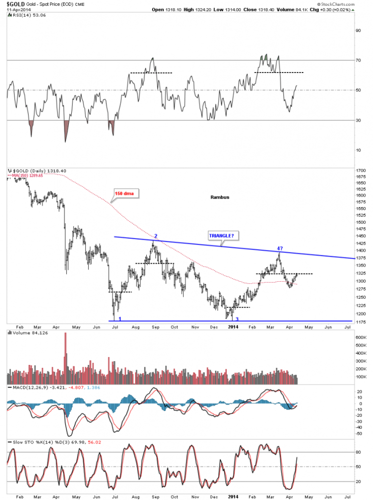 If someone can look at this weekly chart for silver and tell me silver is in an uptrend I would have to call them crazy. Just look at the price action on the left side of the chart when silver was going parabolic creating a series of higher highs and higher lows all the way up to its bull market top. Now compare that price action to the right hand side of the chart since silver topped out just under 50 in April of 2011. Silver has now completed three years of its bear market, this month, by creating lower lows and lower highs. This is basic elementary Chartology. Maybe something will happen to create a new higher high and higher low but until that happens the major trend is down and that is the best direction to trade unless you’re a day trader. It’s always the easiest to trade in the same direction of the major trend as it can fix a mistake if you bought at the wrong time. Just the opposite in a bull market.