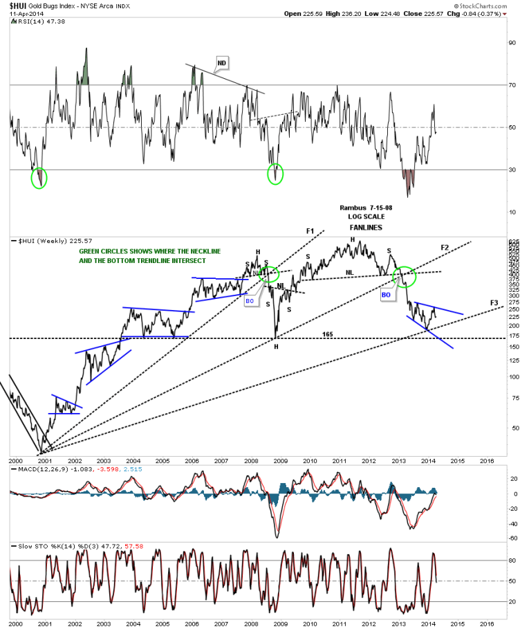 Let's now put our blue consolidation patterns in perspective so you can see how they fit into the big picture. This first chart is for the HUI, which is a long term weekly line chart, that goes all the way back to the beginning of the bull market. Keep in mind a line chart only uses the closing price so the patterns will look slightly different. There is a lot of good information on this chart that we can use to help us understand where we are in the big picture. First notice all the blue consolidation patterns that formed during the bull market years, one on top of the other. That’s a bull market folks. Next notice our massive H&S top that reversed the bull market and has led to our current price. We are now reversing symmetry down and what I believe is our first consolidation pattern to the downside with its blue counterpart on the left side of the chart. Next lets look at the fanlines which is a chart pattern. The rule of thumb is when the 3rd fanline is broken to the downside is when you get your big move. Note fanline #1 and #2 that have the green circle around where the fanline and the neckline intersect. Once that area was broken to the downside the HUI wasted little time declining in earnest. Some of our long term subscribers may remember this chart as I was showing it as we were watching the neckline and fanline #2 breaking down. A daily bar chart will show there was a small backtest to the underside of the neckline before the impulse move began.